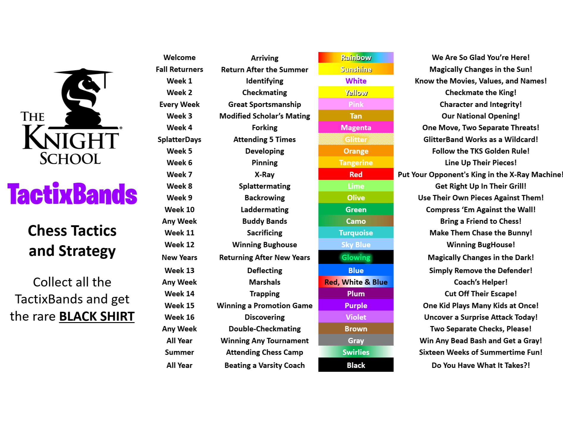 Upon enrollment, new students receive a TKS T-Shirt, chess set, chess bag, and all the colorful TactixBands they can earn!